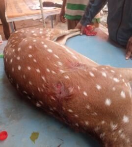 जंगल से भटके हिरण के बच्चे पर इलाके में घूम रहे लावारिस कुत्तों ने अचानक हमला कर दिया। कुत्तों ने उसे कई जगहों पर काटा और नाखूनों से नोचकर गंभीर रूप से घायल कर दिया, जिससे उसके शरीर पर कई जख्म हो गए।
