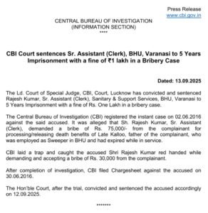 BHU Clerk को घूसखोरी मामले में 5 साल की सजा, 1 लाख रुपये जुर्माना: CBI कोर्ट का बड़ा फैसला