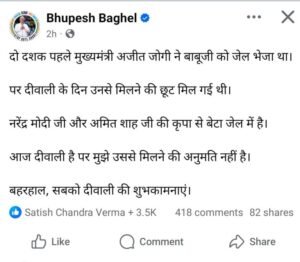 दीपावली पर भावुक हुए भूपेश बघेल – बोले, “20 साल पहले बाबूजी से मिलने की मिली थी अनुमति, आज बेटे से नहीं मिलने दिया गया”