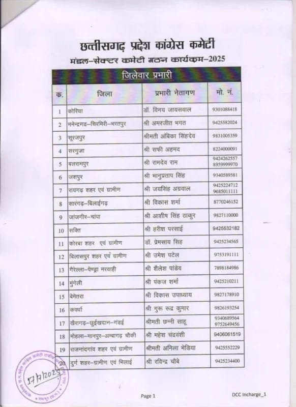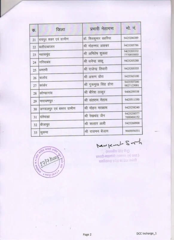 रायपुर: छत्तीसगढ़ प्रदेश कांग्रेस कमेटी (PCC) के अध्यक्ष दीपक बैज ने राज्य के सभी 33 जिलों के लिए जिला प्रभारियों की नियुक्ति की घोषणा की है। यह नियुक्तियां मंडल और सेक्टर कमेटी के पुनर्गठन के उद्देश्य से की गई हैं। पार्टी ने अपने वरिष्ठ नेताओं को विभिन्न जिलों की कमान सौंपी है, ताकि संगठन को और मजबूत किया जा सके।