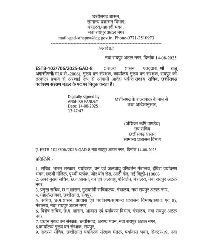 रायपुर, 14 अगस्त 2025: छत्तीसगढ़ सरकार ने भारतीय वन सेवा (IFS) के वरिष्ठ अधिकारी राजू अगासिमनी को छत्तीसगढ़ पर्यावरण संरक्षण मंडल (सीजीईसीबी) का सदस्य सचिव नियुक्त किया है। यह नियुक्ति तत्काल प्रभाव से लागू होगी।