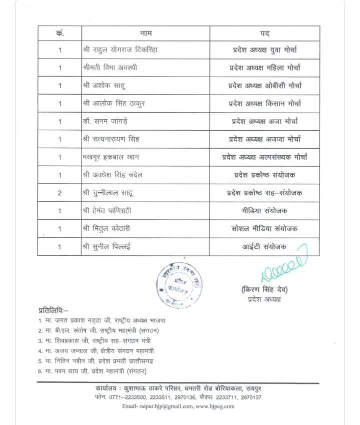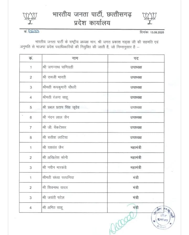 Chhattisgarh बीजेपी कार्यकारिणी का विस्तार: 47 नए पदाधिकारियों की नियुक्ति