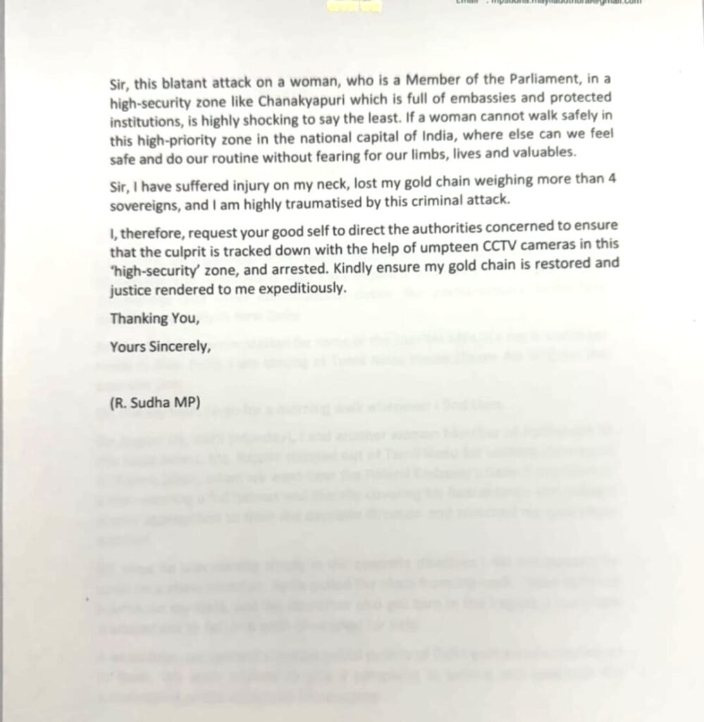 सुधा ने अपनी शिकायत में बताया कि वे नियमित रूप से संसदीय समितियों की बैठकों और अन्य कर्तव्यों के लिए नई दिल्ली में रहती हैं और पिछले एक साल से तमिलनाडु हाउस (कमरा नंबर 301) में ठहर रही हैं। सोमवार को सुबह करीब 6:15 बजे, वे और राज्यसभा सांसद मस. राजिथा तमिलनाडु हाउस से टहलने के लिए निकली थीं। इस दौरान एक स्कूटी सवार व्यक्ति ने उनकी सोने की चेन छीन ली और फरार हो गया।