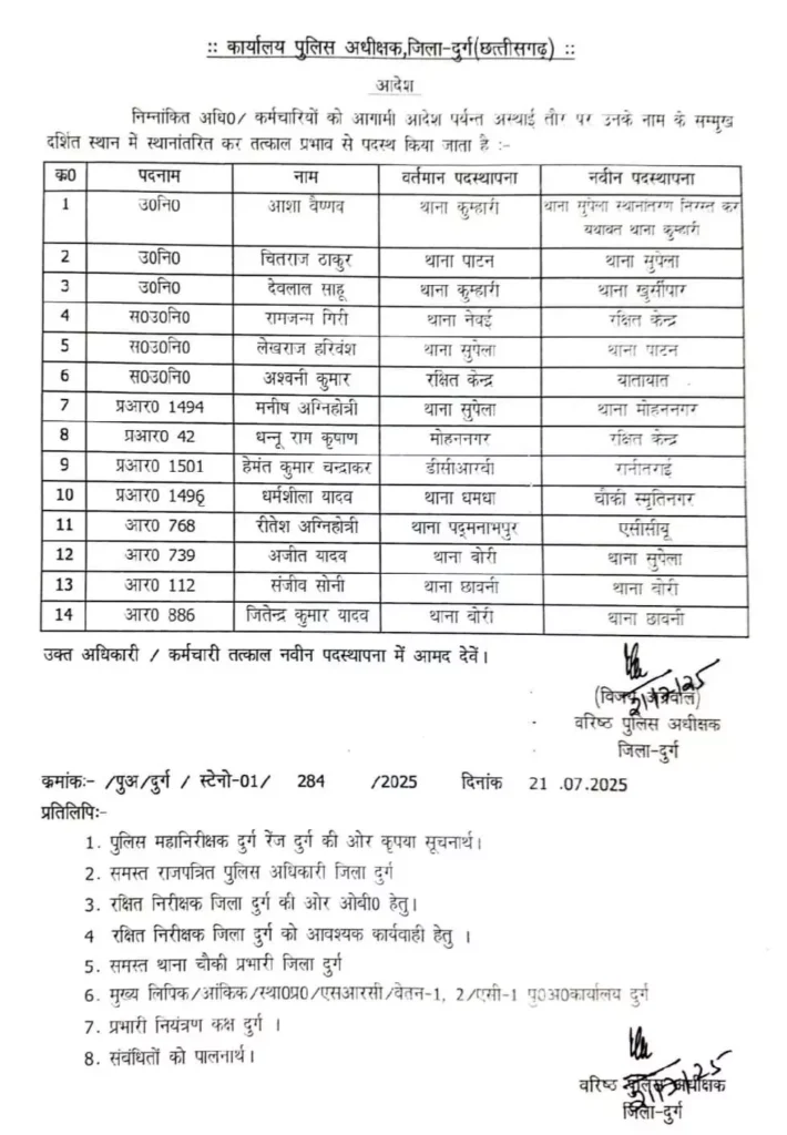 दुर्ग: जिले में कानून-व्यवस्था को और सुदृढ़ करने के उद्देश्य से पुलिस विभाग ने 14 पुलिसकर्मियों का तबादला किया है। इस प्रशासनिक फेरबदल को तत्काल प्रभाव से लागू किया गया है।