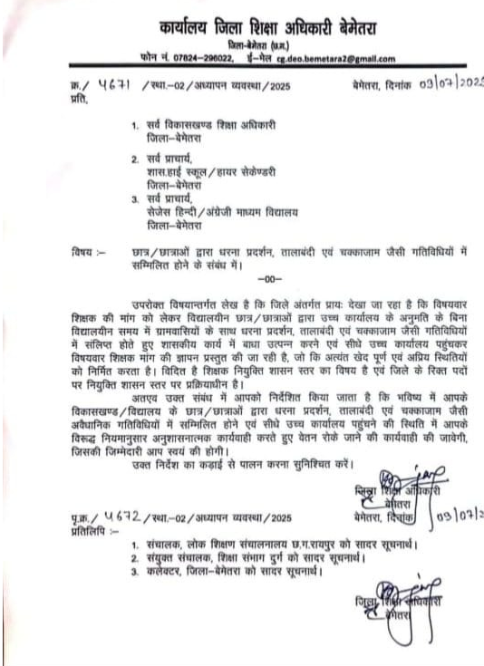 छत्तीसगढ़ के शिक्षा विभाग ने स्कूल प्राचार्यों के खिलाफ सख्त कदम उठाने का फैसला किया है। बेमेतरा जिले में शिक्षा विभाग ने एक पत्र जारी कर स्पष्ट किया कि यदि स्कूल के छात्र अपनी मांगों को लेकर सड़क पर उतरते हैं, तो संबंधित स्कूल के प्राचार्यों को इसके लिए जिम्मेदार ठहराया जाएगा। इस तरह की घटनाओं के परिणामस्वरूप प्राचार्यों का वेतन रोका जा सकता है और उनके खिलाफ अनुशासनात्मक कार्रवाई भी की जाएगी।