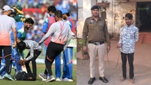 रायपुर। भारत और दक्षिण अफ्रीका के बीच शहीद वीर नारायण सिंह अंतरराष्ट्रीय क्रिकेट स्टेडियम में खेले गए दूसरे वनडे मैच के दौरान एक बड़ा हंगामा हो गया। भारतीय पारी के ड्रिंक्स ब्रेक में एक युवक अचानक सुरक्षा घेरा तोड़कर सीधे मैदान में घुस आया और स्टार बल्लेबाज़ विराट कोहली के पैर छू लिए। सुरक्षा कर्मियों ने तुरंत युवक को पकड़कर मैदान से बाहर ले जाया।