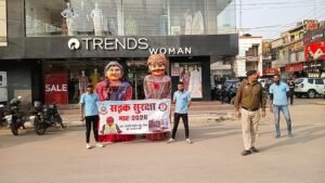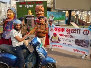 दुर्ग-भिलाई | ‘राष्ट्रीय सड़क सुरक्षा माह 2026’ के अंतर्गत दुर्ग पुलिस आम नागरिकों को यातायात नियमों के प्रति जागरूक करने के लिए लगातार नई पहल कर रही है। इसी कड़ी में रविवार को लगातार दूसरे दिन पुलिस ने कठपुतली शो (Puppet Show) के माध्यम से लोगों को सड़क पर सुरक्षित चलने का संदेश दिया। इस दौरान यातायात नियमों का पालन करने वाले जागरूक नागरिकों को पुलिस द्वारा गुलाब का फूल भेंट कर सम्मानित भी किया गया।