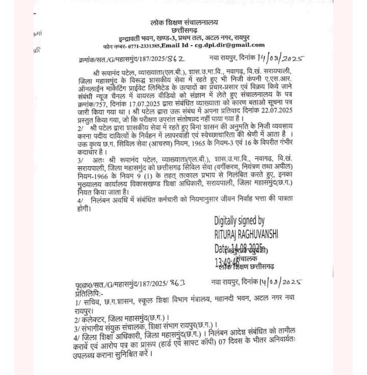 महासमुंद, 18 अगस्त 2025: छत्तीसगढ़ के महासमुंद जिले में एक सरकारी शिक्षक को शिक्षा विभाग ने निलंबित कर दिया है। शिक्षक, जिनकी पहचान रूपानंद पटेल के रूप में हुई है, पर आरोप है कि उन्होंने सरकारी सेवा में रहते हुए एक निजी ऑनलाइन मार्केटिंग कंपनी के लिए प्रचार किया। इस कार्रवाई ने जिले में शिक्षक समुदाय और स्थानीय लोगों के बीच चर्चा का विषय बना दिया है।