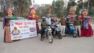 दुर्ग। राष्ट्रीय सड़क सुरक्षा माह–2026 के तहत दुर्ग पुलिस द्वारा सड़क सुरक्षा एवं यातायात नियमों के पालन को लेकर लगातार जागरूकता कार्यक्रम आयोजित किए जा रहे हैं। इसी कड़ी में शनिवार 24 जनवरी 2026 को दुर्ग पुलिस ने एक अभिनव पहल करते हुए कठपुतली कला के माध्यम से आम नागरिकों को यातायात नियमों का संदेश दिया।