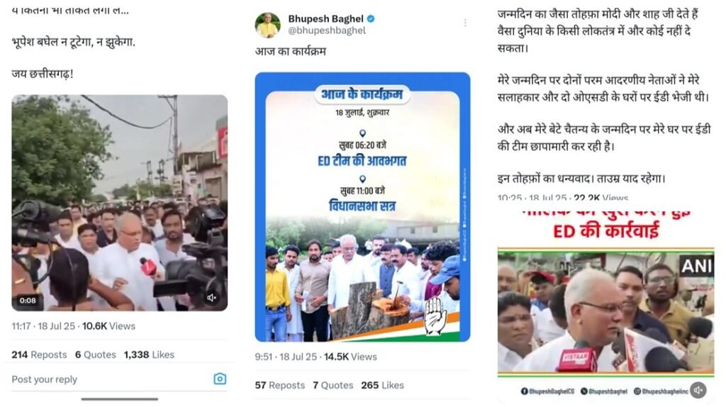 “पिछली बार मेरे जन्मदिन पर ED आई थी, और इस बार मेरे बेटे के जन्मदिन पर मोदी और शाह ने अपने मालिक को खुश करने के लिए ED भेजी है। लेकिन भूपेश बघेल न टूटेगा और न ही झुकेगा।”